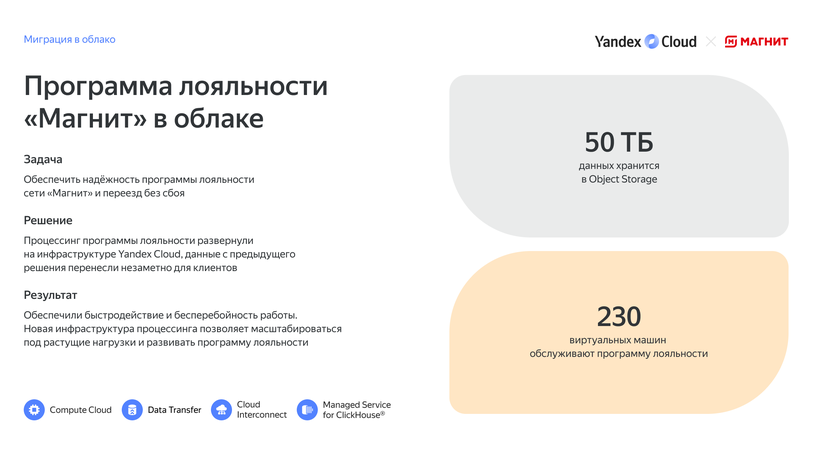 «Магниту» была нужна интеграция программы лояльности с мобильным приложением, службой доставки, кассовым ПО и корпоративным хранилищем данных. Для этого компании требовалась надёжная облачная инфраструктура. У «Магнита» уже был опыт использования инфраструктуры Yandex Cloud для других задач. Кроме того, Yandex Cloud уже обеспечивал надёжное хранение и обработку 1 ПБ данных «Магнита», поэтому выбор пал на эту облачную платформу.