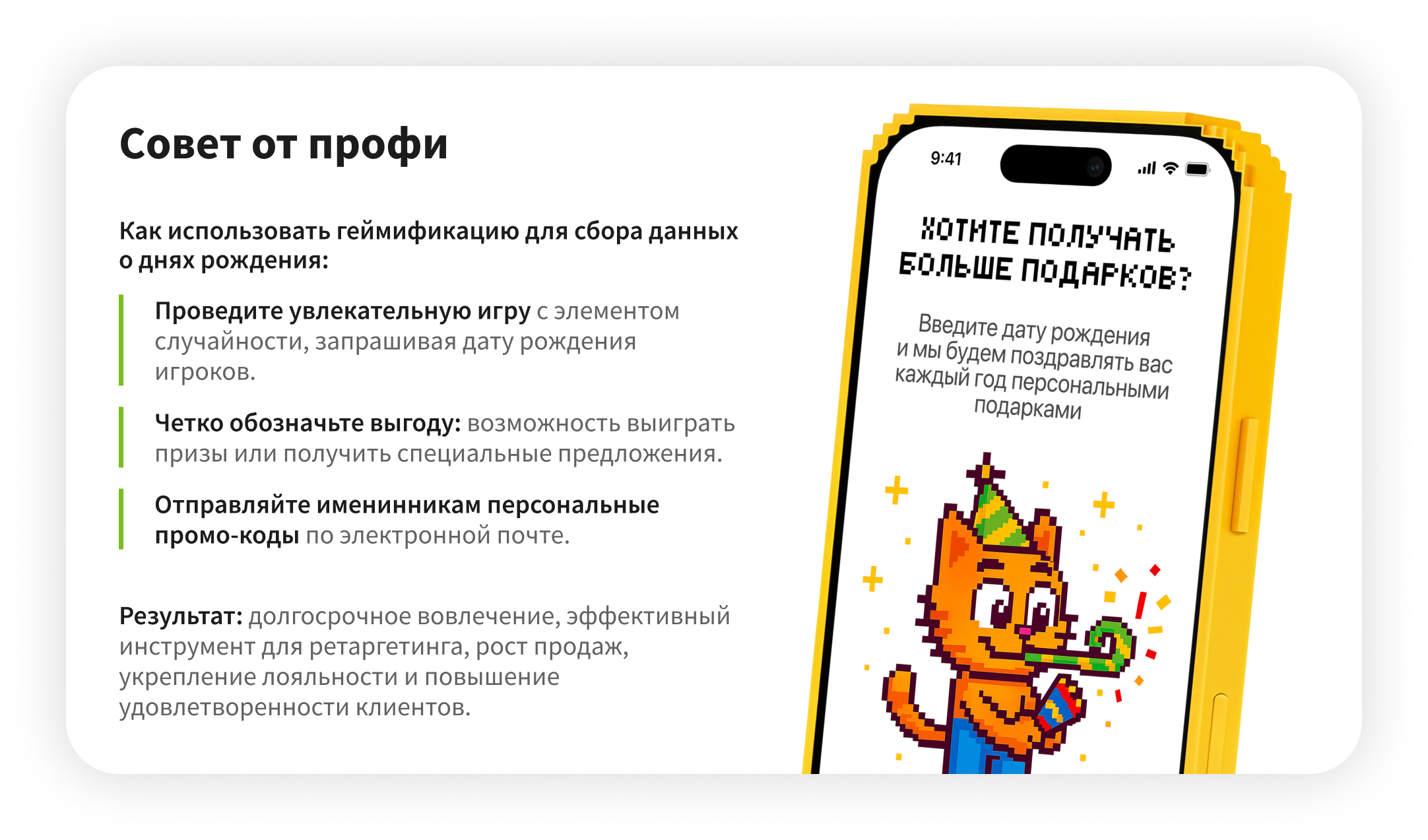 Современные потребители ждут от любимых брендов персонализированного подхода. Чтобы оправдать эти ожидания, компаниям необходимо собирать и анализировать данные о клиентах.Например, игровой тест на определение типа личности или потребительского профиля помогает в легком формате собрать ключевую информацию о предпочтениях, привычках и важных датах. Полученные инсайты становятся основой для выстраивания индивидуальной коммуникации, специальных предложений и сервиса, который не просто нравится, а вызывает лояльность и эмоциональную связь с брендом.