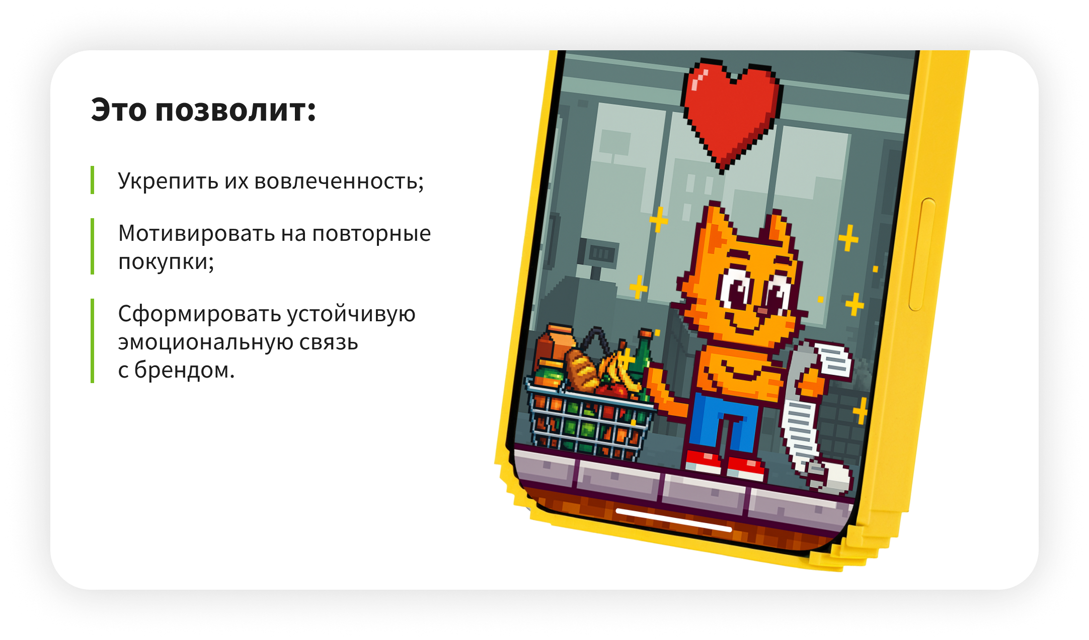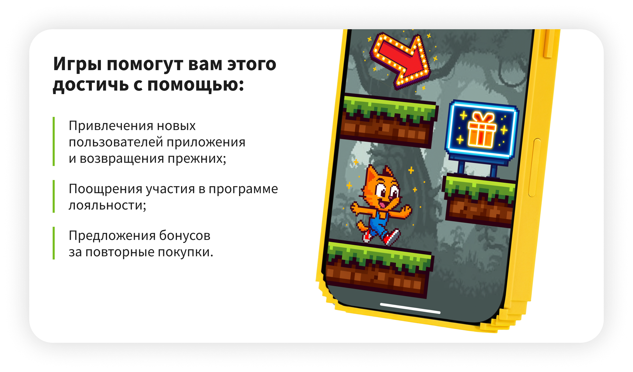 Превратить покупателя в настоящего поклонника бренда — цель любой долгосрочной стратегии. Но настоящая лояльность не дается просто так, ее нужно завоевать.Эффективный способ добиться этого — внедрение игровых механик. Они помогают привлекать аудиторию в приложение, вовлекать в программу лояльности и поощрять повторные покупки. Ожидание нового вознаграждения и удовольствие от процесса превращают обычные покупки в увлекательную привычку, побуждая покупателей выбирать вас вновь.