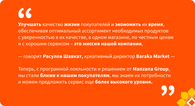 Baraka Market – узбекская сеть розничных магазинов товаров народного потребления. В связи с планами по развитию сети и стремлением предоставить покупателям дополнительные сервисы, в том числе персонализированные, было принято решение о запуске программы лояльности. Manzana Group помогла автоматизировать программу лояльности сети Baraka с использованием Manzana Loyalty Online.