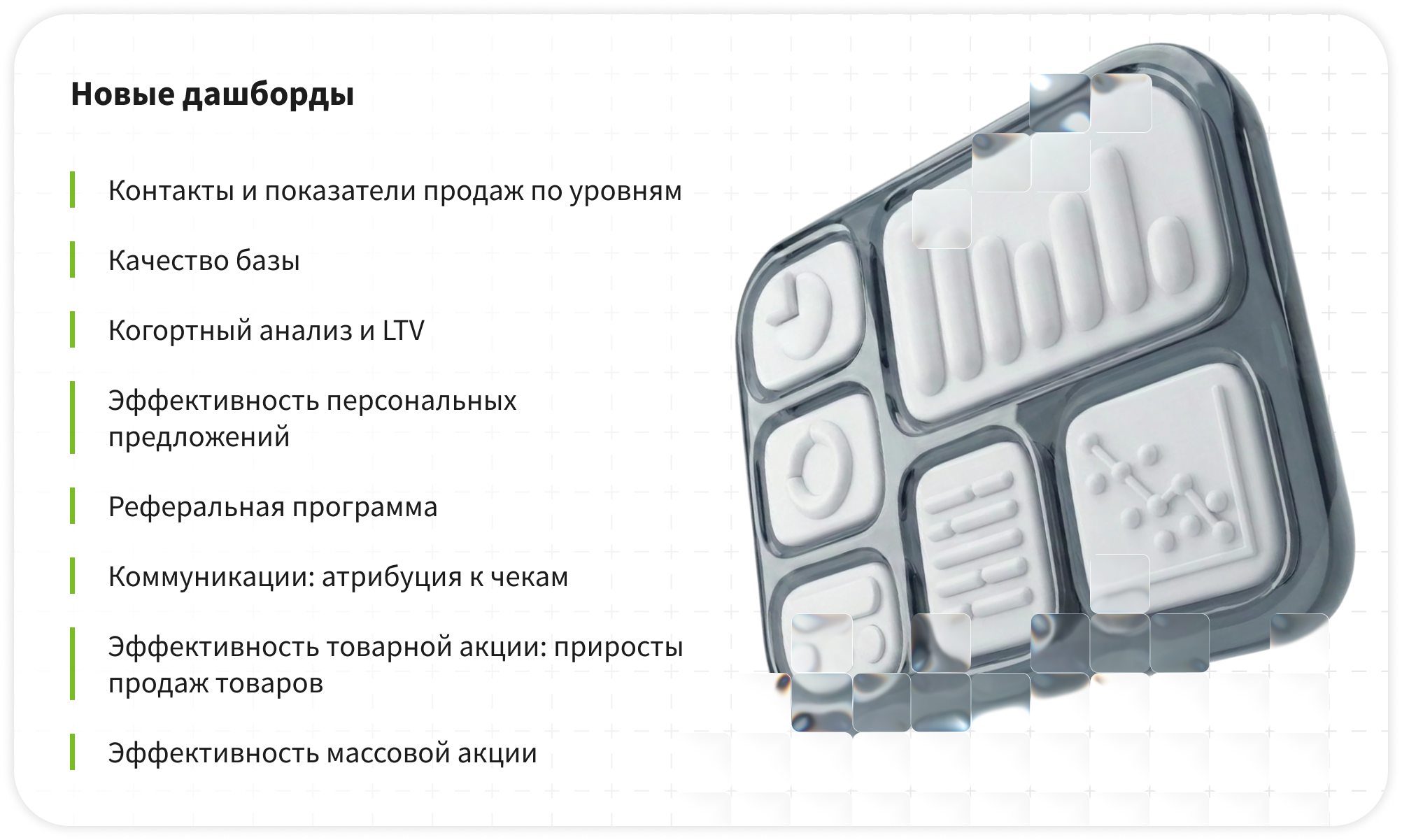 Созданы и описаны новые дашборды, которые позволяют не просто смотреть на цифры, а видеть точки роста программы лояльности и бизнеса в целом. От когортного анализа до оценки эффективности массовых и товарных акций — каждый отчёт продуман до мелочей, чтобы отвечать на самые острые вопросы.Решения, основанные на данных, — это решения, которые работают. Мы дали командам не просто инструмент, а язык, на котором можно договариваться о результатах.
