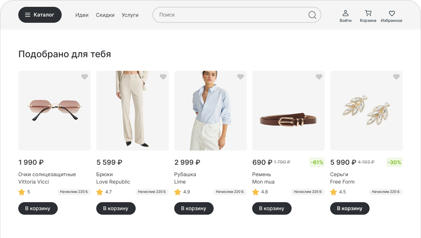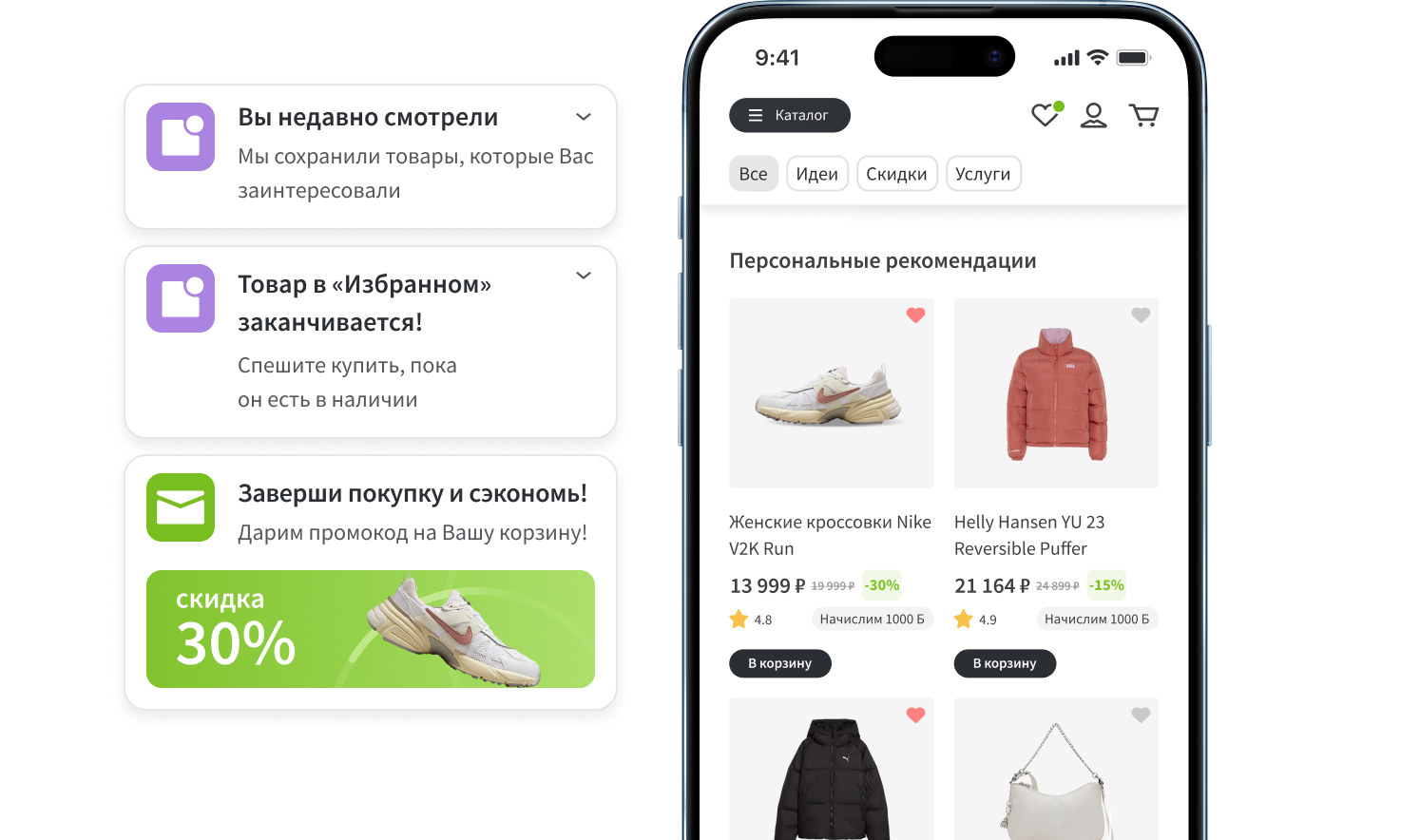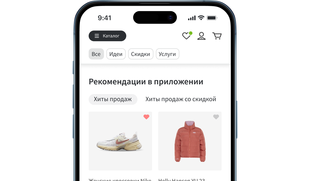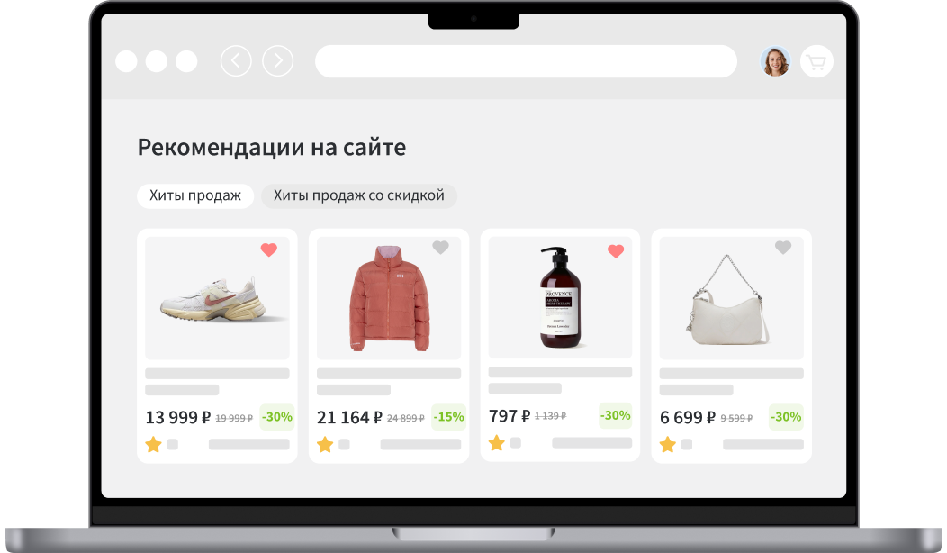 Учитывает просмотры, заказы, избранное, историю корзины и поведение похожего сегмента.